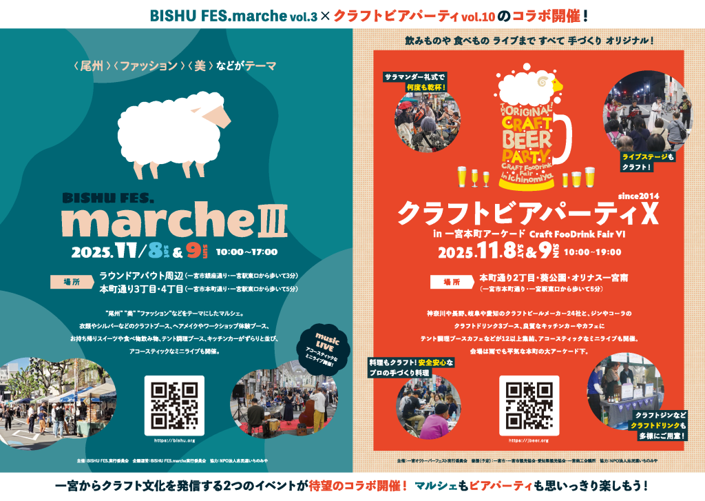 2025年11月8日(土) 9日(日)に一宮市東口駅近くでコラボ開催される「BISHU FES.marche Ⅲ」と「クラフトビアパーティⅩ」。